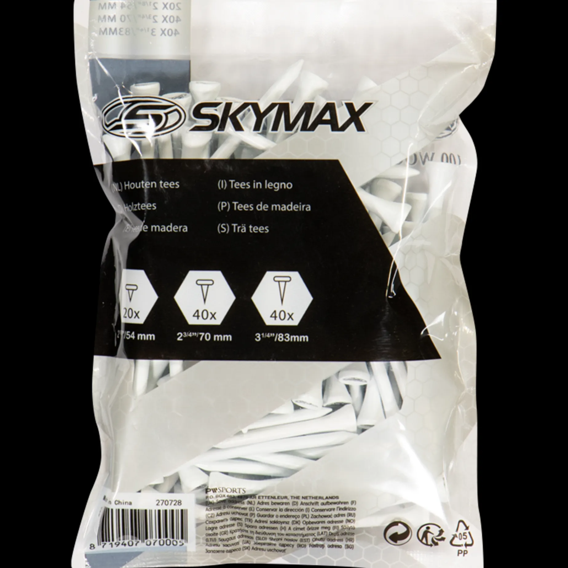 Wooden Tees 83/69/53 Mm (100 Pcs) Är Vita Med Svart Skymax-Logo. Tillverkade I Schimaträ.
